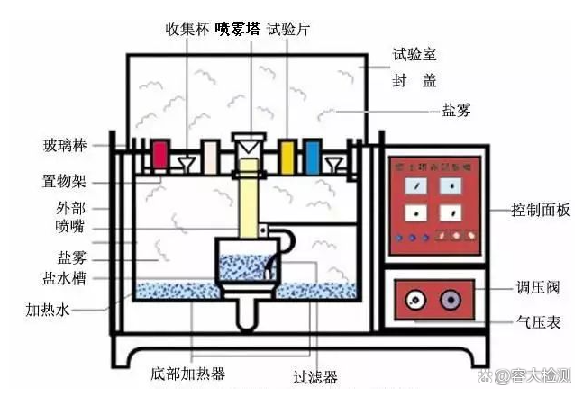 人工模擬鹽霧環(huán)境試驗(yàn)是利用一種具有一定容積空間的試驗(yàn)設(shè)備——鹽霧試驗(yàn)箱(如圖),在其容積空間內(nèi)用人工的方法,造成鹽霧環(huán)境來對(duì)產(chǎn)品的耐鹽霧腐蝕性能質(zhì)量進(jìn)行考核。
