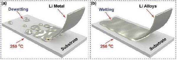 馬里蘭大學(xué)的胡良兵副教授(通訊作者)在著名期刊Advanced Energy Materials上發(fā)表了題為“Universal Soldering of Lithium and Sodium Alloys on Various Substrates for Batteries”的論文,第一作者為王成威博士,共同第一作者為在讀博士生謝華。該文章報(bào)道了一種通用焊接技術(shù),可以快速地將熔融的金屬鋰或金屬鈉涂覆在不同的基底上用于固態(tài)電池和其他應(yīng)用領(lǐng)域。通過(guò)添加合金成分,熔融鋰的表面能和粘性都增加了。富鋰的熔融合金在陶瓷、金屬和聚合物等基底上展示了良好的浸潤(rùn)性。